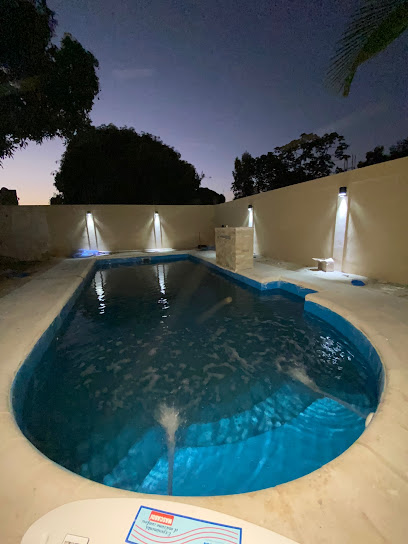 Servicio de venta e instalación de piscinas de fibra de vidrio y material, accesorios de piscinas y consultorio.